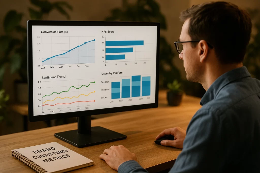 Use a blend of behavioral and emotional metrics. Track bounce rates, NPS, cross-channel conversion rates, and consistency in user-reported brand associations. Run surveys asking users to describe your brand in three words—then compare responses across platforms. If answers align, you’re on the right track. Analytics tools like Mixpanel, FullStory, and Brandwatch can show where drop-offs or sentiment shifts occur. Also measure operational efficiency: are teams creating faster with fewer approvals?