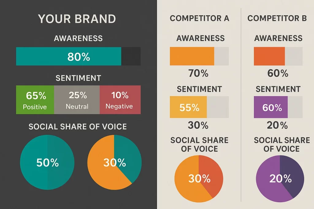 A Brand Performance Metrics Dashboard without context is like a GPS without a map—it shows movement, but not direction. That’s why competitor benchmarks are critical. They bring meaning to your KPIs by helping you understand whether your performance is exceptional, average, or underwhelming.